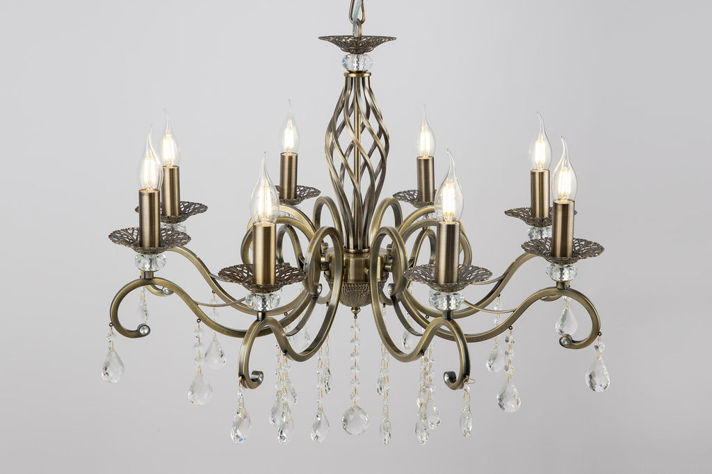 Structure en métal, finition blanc et or. Abat-jour en organza blanc plissé. Pendentifs en cristal.