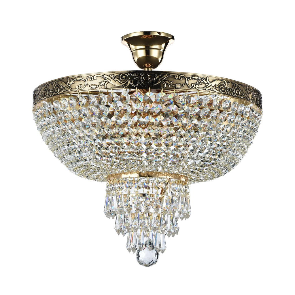 Structure en métal, finition laiton. Cristaux de différentes tailles et formes.