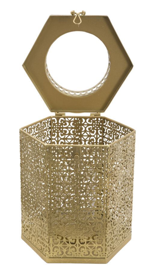 Lanterne élégante avec poignée en métal doré. Les sculptures particulières, éclairées par une bougie, rendent chaque environnement magique.