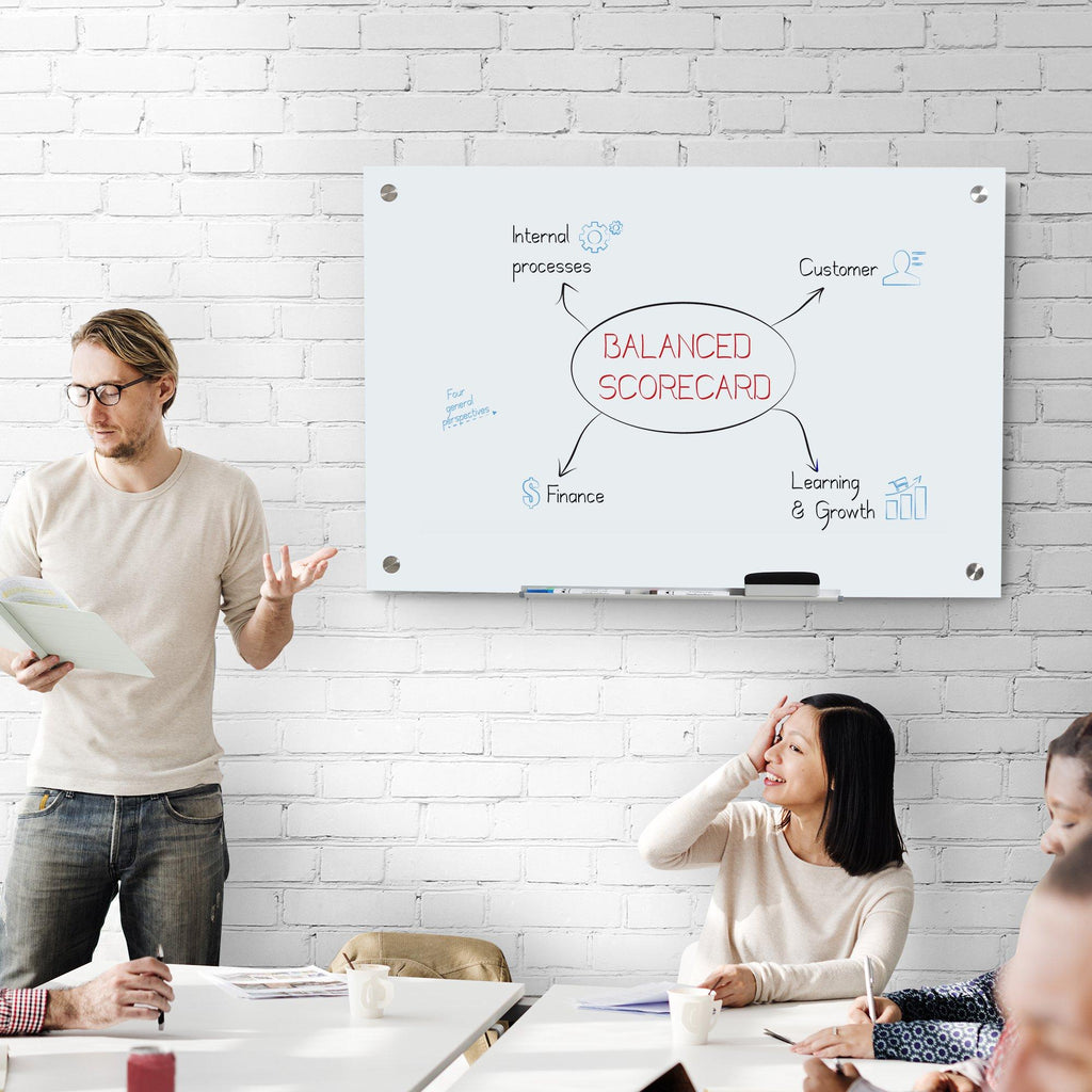 Vous ne voulez pas déjà écrire à ce sujet ? Avec sa surface lisse, son jeu de marqueurs colorés et son look élégant, ce tableau blanc en verre est parfait pour le bureau, l'étude, l'école ou votre maison. Peu importe le nombre de choses que vous souhaitez dessiner ou écrire : vous disposez enfin de tout l'espace dont vous avez toujours rêvé.