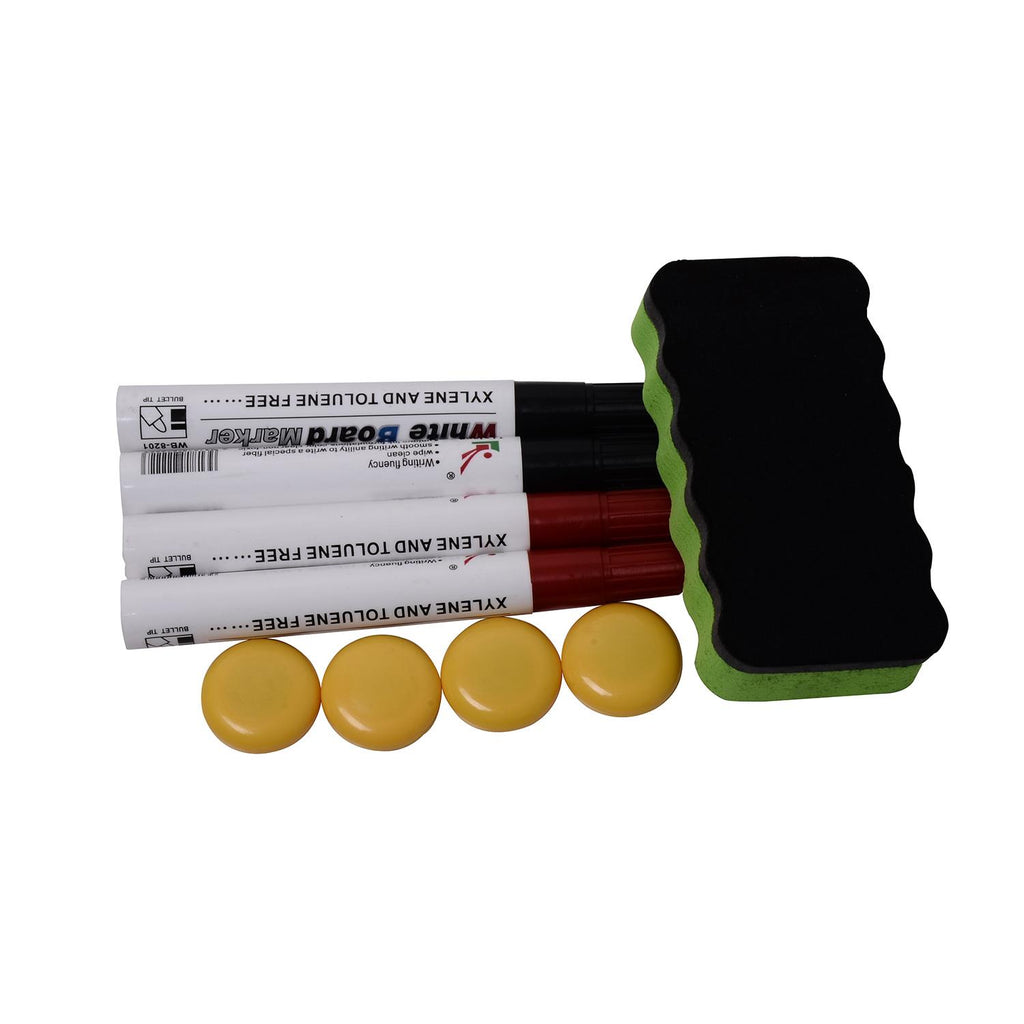 - Comprend 4 marqueurs (2 rouges + 2 noirs), une gomme et 4 aimants