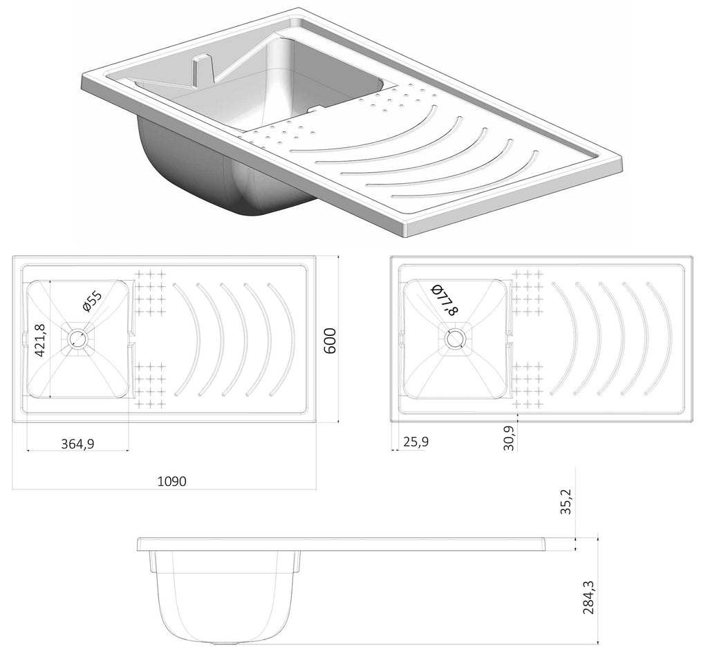 Complet avec planche de lavage en résine et siphon autonettoyant avec mécanisme de trop-plein.