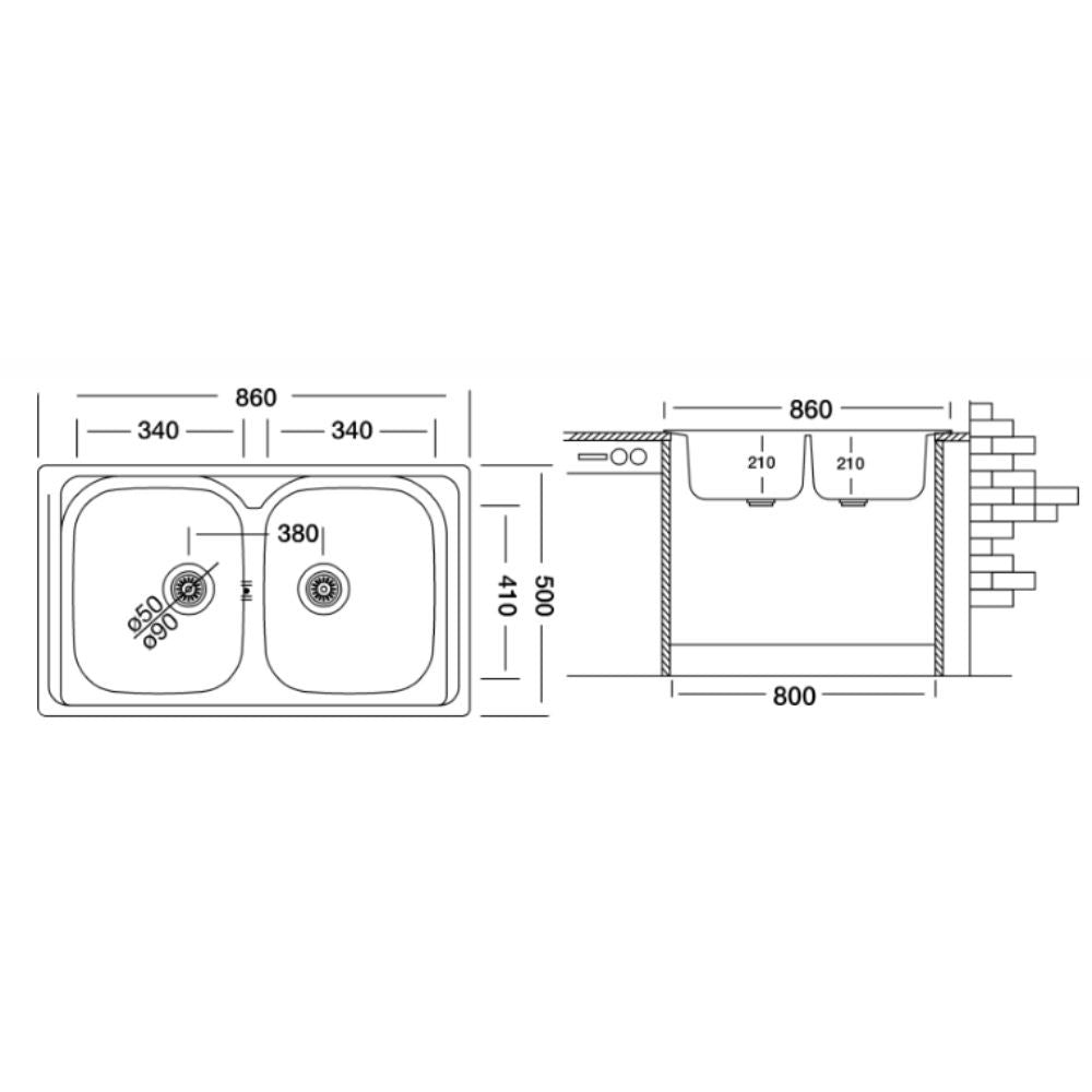 Évier 86x50 cm double cuve