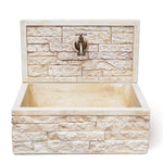 Lavello tipo pietra con frontale Q-Meseta è resistente e leggero, infatti pesa solo 27 kg. Realizzato in cemento bianco e granuto di marmo, anticatura nocciola. Prodotto 100% Made in Italy