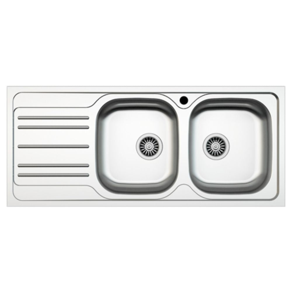 Évier de cuisine encastrable en acier 116x50 cm, deux bacs et égouttoir à gauche.