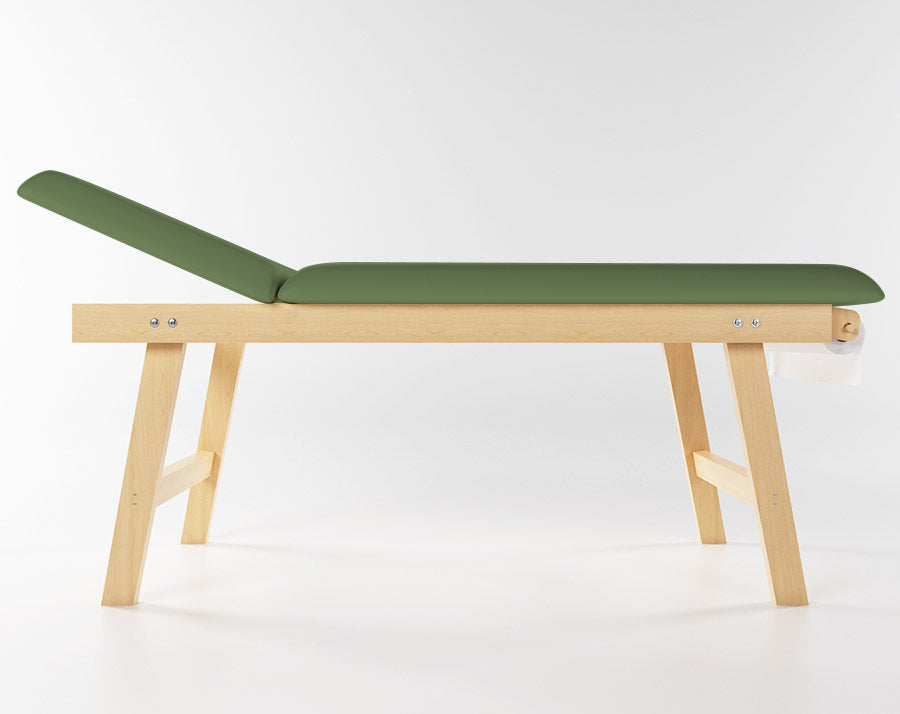 Fabriqué en bois de hêtre massif Pollmeier de couleur naturelle, avec un rembourrage en mousse 18/D et une housse en similicuir lavable, ce lit peut être utilisé par les salons de beauté et les centres médicaux, mais le rend également adapté aux centres de massage et de physiothérapie. Ce lit est équipé d'une tête de lit réglable grâce à des charnières spéciales en acier galvanisé et d'un porte-rouleau très utile.
