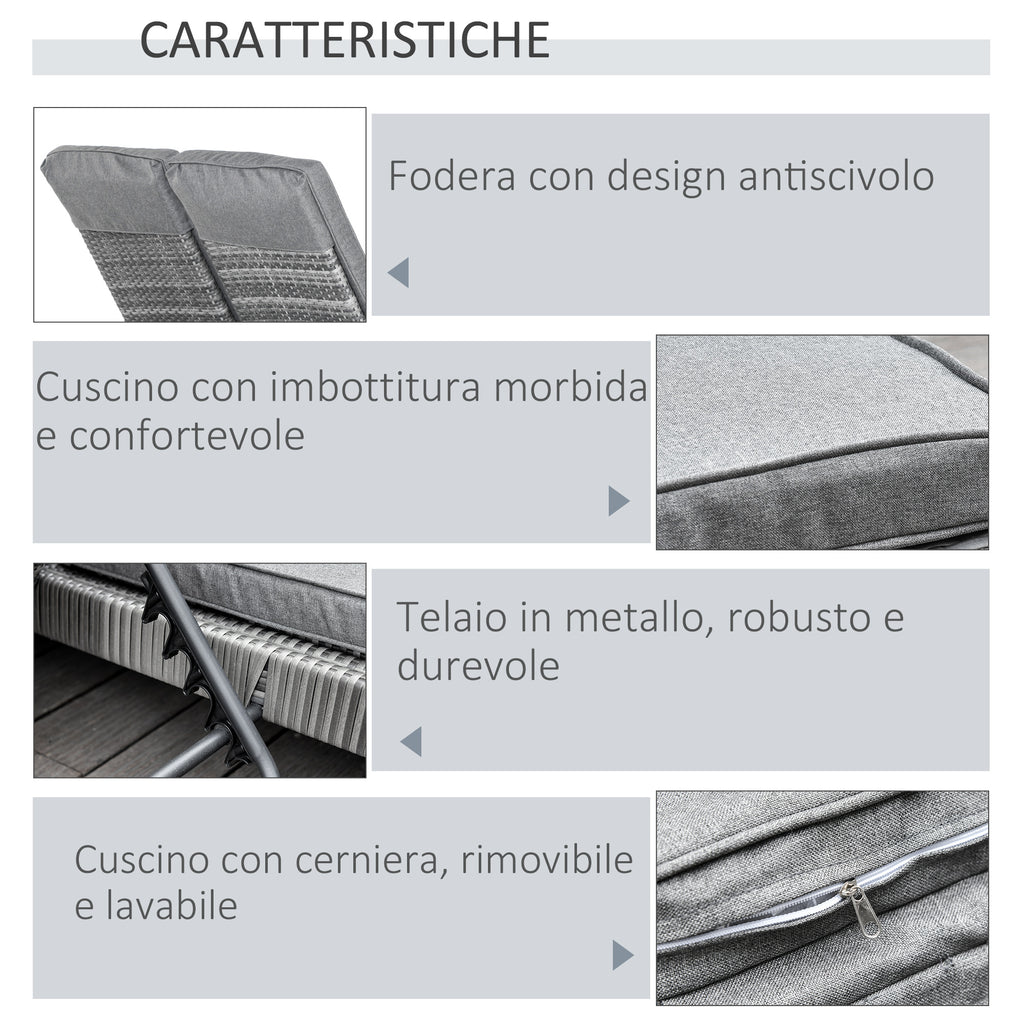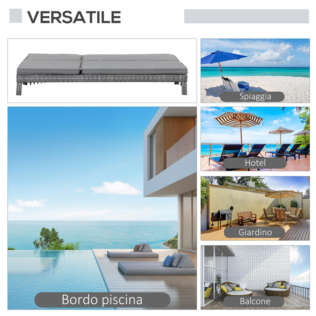 Profitez du soleil sur votre nouveau transat 2 places. Fabriqué en acier et en osier synthétique, c'est un produit extrêmement stable et résistant. Le confort est assuré grâce aux 2 matelas rembourrés et au dossier réglable sur 5 niveaux. La couleur grise est délicate et raffinée : parfaite pour apporter une touche d'élégance à votre environnement.