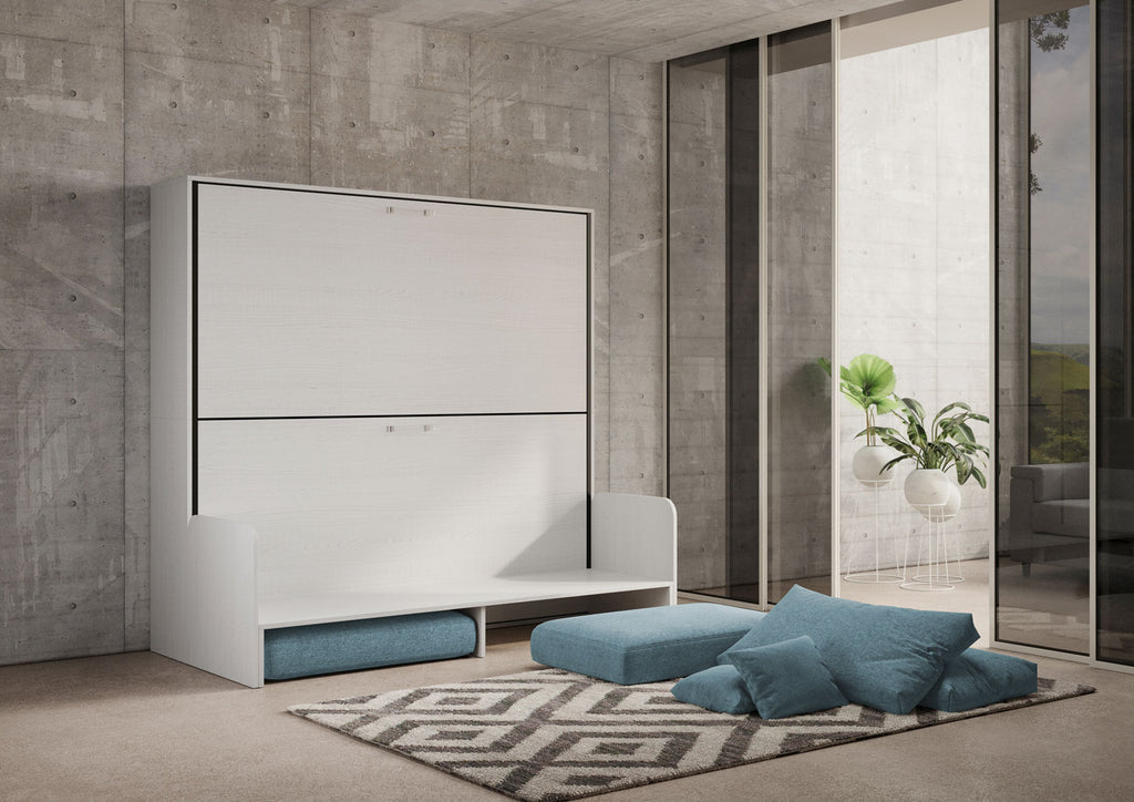Letto Doppio A Scomparsa Kando Con Divano Bianco Frassino e Azzurro