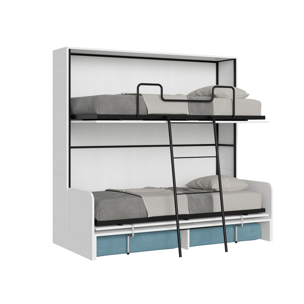 Letto a scomparsa orizzontale Kando versione con due letti singoli a castello con divano. Questo mobile salvaspazio è ideale per il living: funge da divano comodo di giorno e si trasforma velocemente in un letto confortevole quando serve, offrendo sia comfort che praticità, ideale per chi ha a disposizione spazi ridotti. I cuscini del divano, completamente sfoderabili, sono realizzati in microfibra. Il colore del rivestimento come immagini. Struttura del letto e del divano realizzate con pannelli di particelle di legno nobilitato sp.18 mm. Struttura della rete in ferro rinforzato verniciato a polvere epossidica colore alluminio goffrato. Il meccanismo di apertura è provvisto di un sistema anti-chiusura con bloccaggio di sicurezza con maniglie di sgancio laterali. Incluso di rete ortopediche realizzate in doghe di legno lamellare da 85x190 cm con cinghie ferma materasso. Materassi non compresi. Dimensioni consigliate dei materassi: cm 85×185 H.max 14. Il letto rimane stabile grazie ad un meccanismo di sicurezza interno che ne assicura la rigidità. Il letto può essere aperto a propria necessità, solo il letto superiore, solo il letto inferiore o entrambi contemporaneamente. Il letto inferiore è dotato di piedini estraibili che consentono alla rete inferiore di poggiare a terra in tutta sicurezza, mentre il letto superiore è dotato di pratiche scalette per scendere o salire. La discesa dei letti è agevolata dalle maniglie incluse.