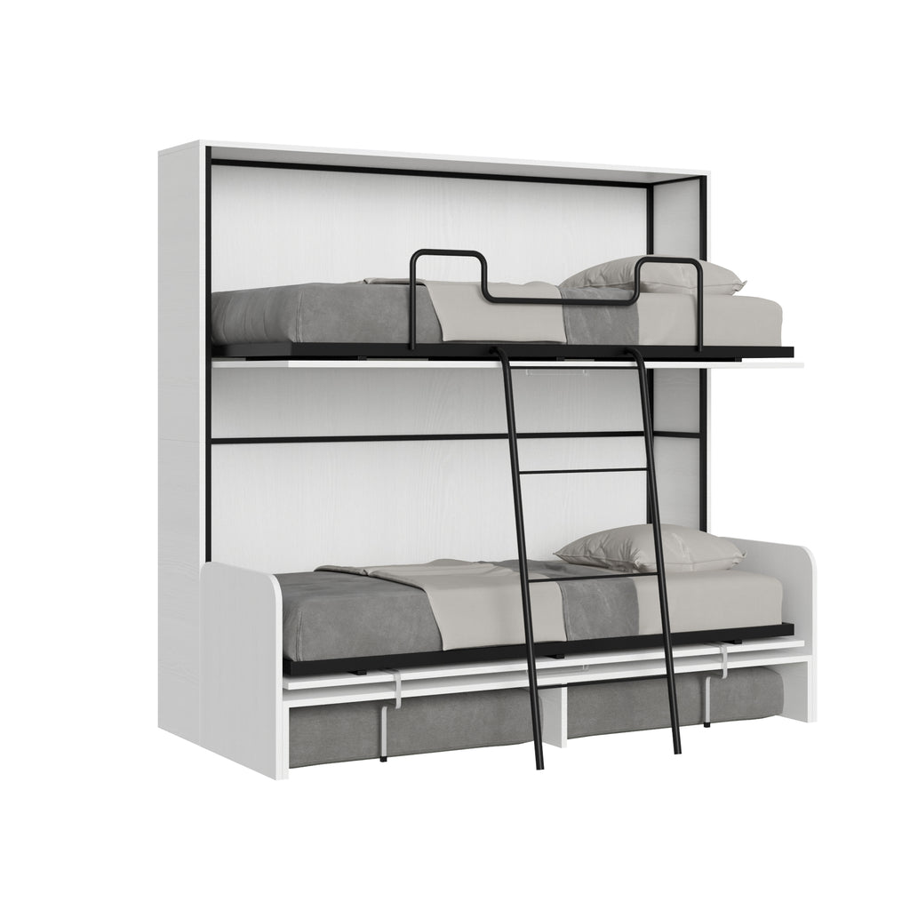 Letto a scomparsa orizzontale Kando versione con due letti singoli a castello con divano. Questo mobile salvaspazio è ideale per il living: funge da divano comodo di giorno e si trasforma velocemente in un letto confortevole quando serve, offrendo sia comfort che praticità, ideale per chi ha a disposizione spazi ridotti. I cuscini del divano, completamente sfoderabili, sono realizzati in microfibra. Il colore del rivestimento come immagini. Struttura del letto e del divano realizzate con pannelli di particelle di legno nobilitato sp.18 mm. Struttura della rete in ferro rinforzato verniciato a polvere epossidica colore alluminio goffrato. Il meccanismo di apertura è provvisto di un sistema anti-chiusura con bloccaggio di sicurezza con maniglie di sgancio laterali. Incluso di rete ortopediche realizzate in doghe di legno lamellare da 85x190 cm con cinghie ferma materasso. Materassi non compresi. Dimensioni consigliate dei materassi: cm 85×185 H.max 14. Il letto rimane stabile grazie ad un meccanismo di sicurezza interno che ne assicura la rigidità. Il letto può essere aperto a propria necessità, solo il letto superiore, solo il letto inferiore o entrambi contemporaneamente. Il letto inferiore è dotato di piedini estraibili che consentono alla rete inferiore di poggiare a terra in tutta sicurezza, mentre il letto superiore è dotato di pratiche scalette per scendere o salire. La discesa dei letti è agevolata dalle maniglie incluse.