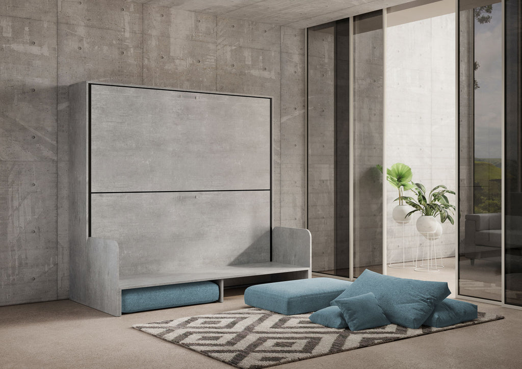 Letto Doppio A Scomparsa Kando Con Divano Cemento e Azzurro