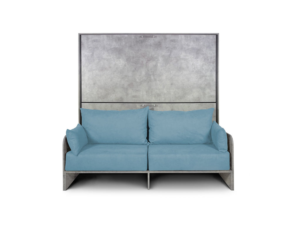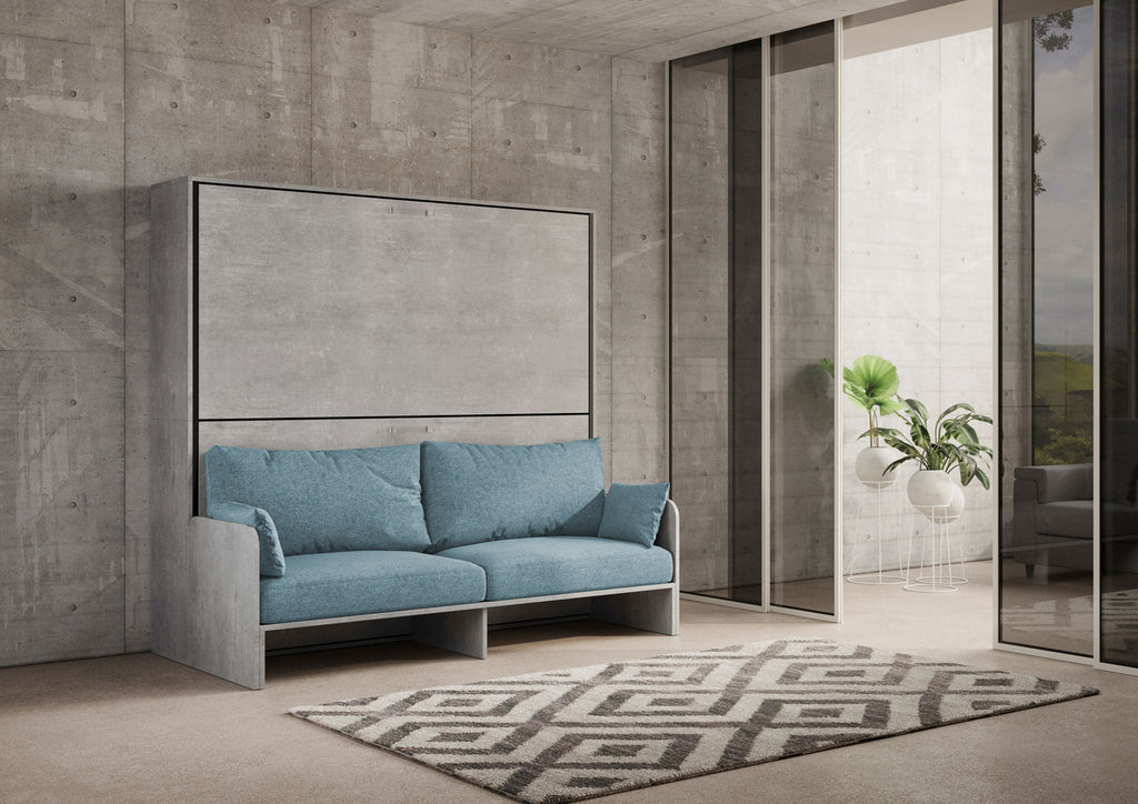 Letto Doppio A Scomparsa Kando Con Divano Con Materassi Cemento e Azzurro