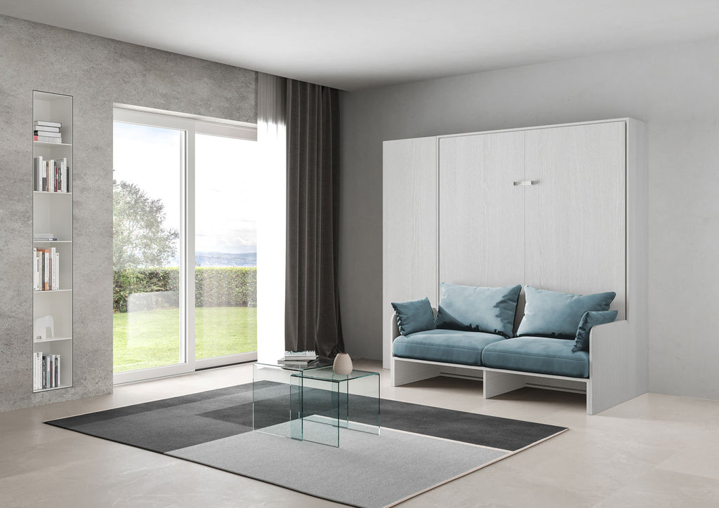 Letto Matrimoniale A Scomparsa 160 Kentaro Con Divano E Colonna Bianco Frassino e Azzurro