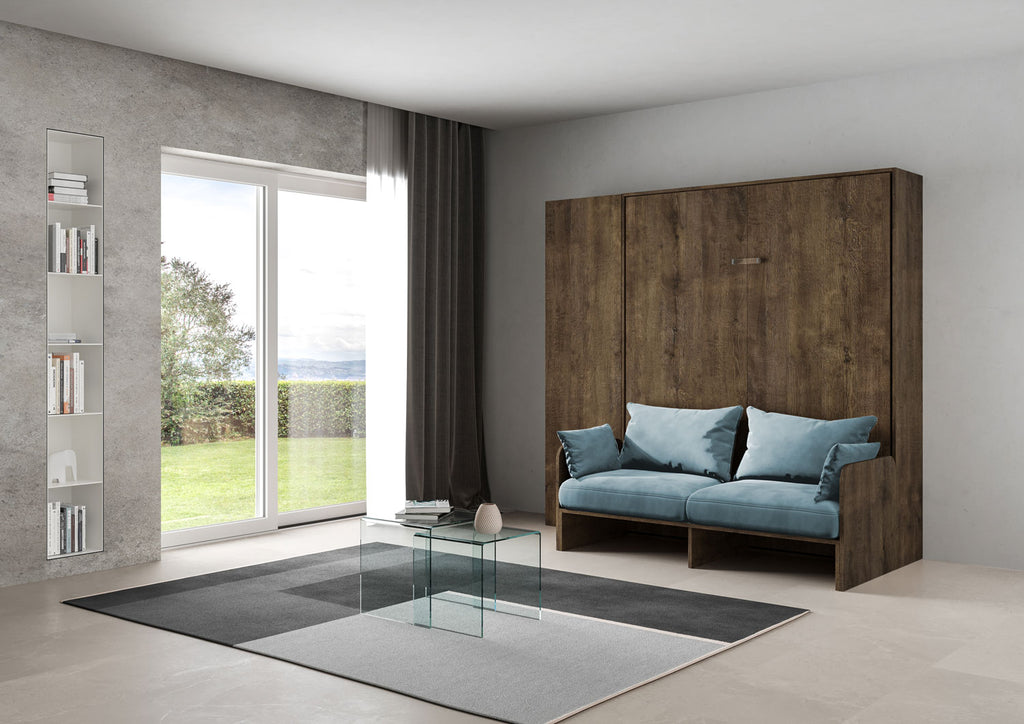 Letto Matrimoniale A Scomparsa 160 Kentaro Con Divano E Colonna Noce e Azzurro