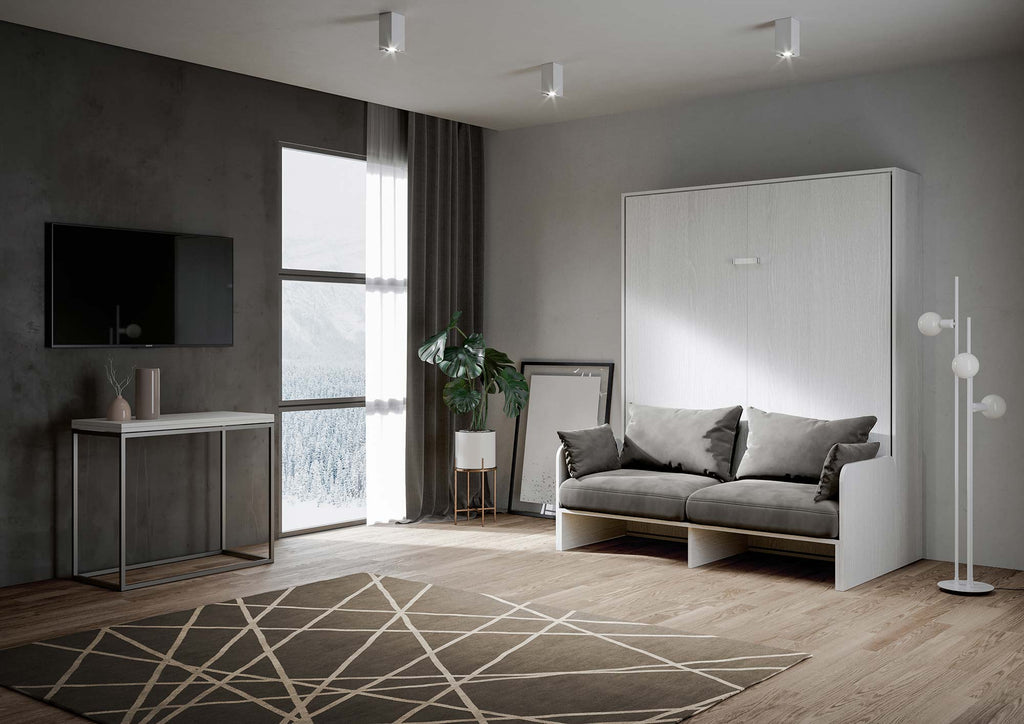 Canapé Kentaro Double, proposé avec revêtement de coussin de canapé de la même couleur que sur la photo. De nos jours, où la modernité nous pousse dans des espaces de vie de plus en plus étroits, est proposé le nouveau modèle de canapé Kentaro Sofà, une idée originale qui en quelques étapes transforme l'espace séjour en espace nuit, devenant un confortable lit double escamotable. Une solution parfaite pour les studios et les petits espaces où chaque mètre carré compte : ce modèle intelligent vous permet d'optimiser votre espace, sans sacrifier la commodité, le confort et le design. Les coussins sont en microfibre et sont entièrement déhoussables. Une fois ouvert, il n'occupe pas plus qu'un lit normal - seulement 215 cm. Le matelas pouvant être utilisé ne doit pas dépasser 160x190 épaisseur maximum 24 cm. Une fois ouvert, la hauteur du filet depuis le sol est de 22 cm. La descente verticale du lit est assistée par des vérins à gaz. La fixation murale est obligatoire.