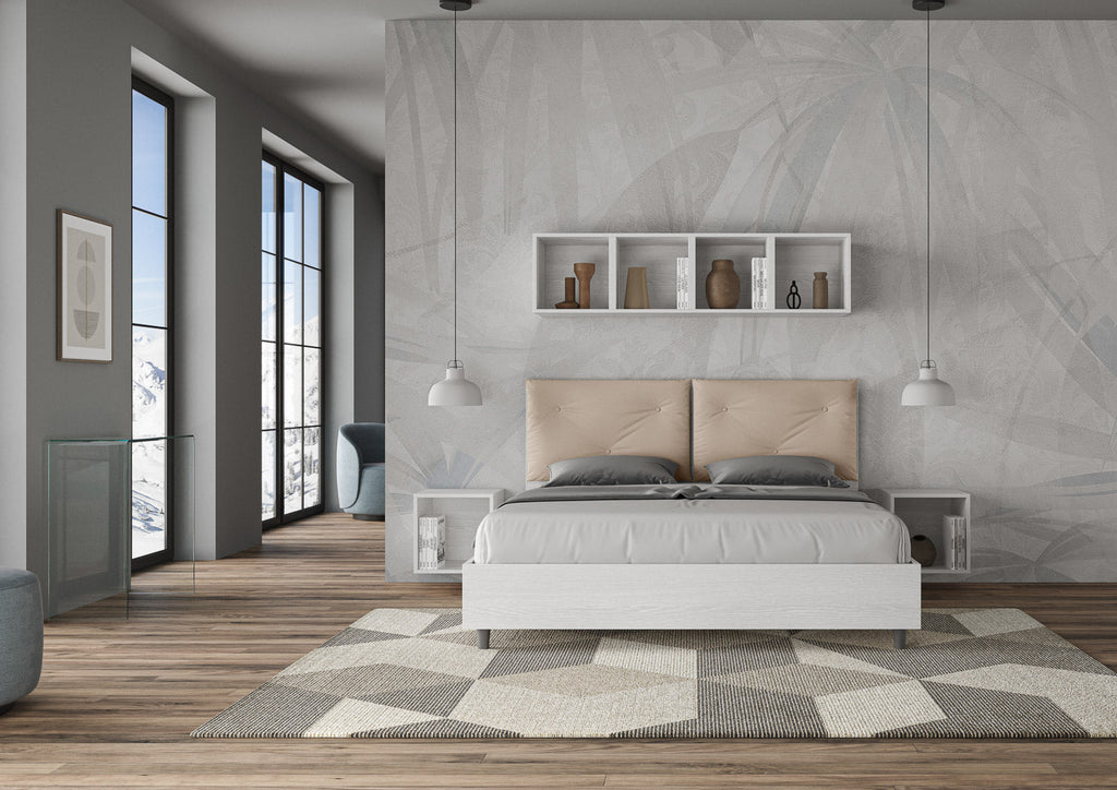 Letto matrimoniale modello Egos Appia, con giroletto in microparticelle di legno e cuscinatura in similpelle. Contraddistinto dalla presenza di due grandi cuscini posizionati nella parte anteriore della testata, il letto Egos Appia è perfetto per sostenere la vostra schiena e la vostra testa, garantendo un relax e un riposto ottimale. I cuscini trapuntati in similpelle sono decorati da bottoni che, assieme al giroletto in legno, assicurano la versatilità ad ogni tipo di abbinamento stilistico. Letto fornito con rete contenitore, predisposto per materasso L.160 P.190