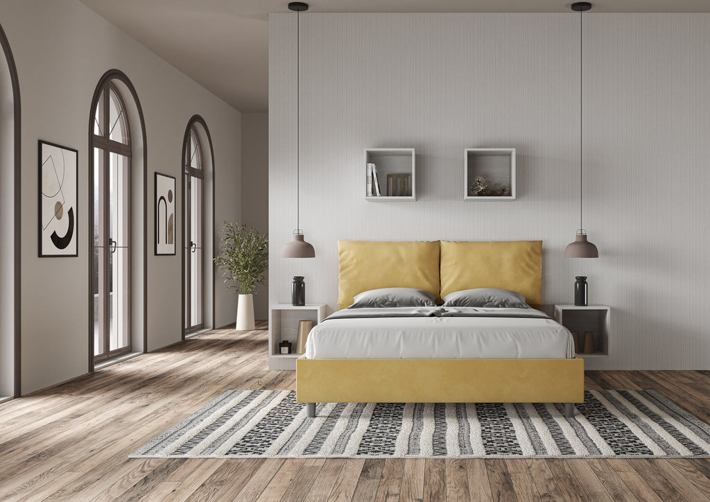 Letto Matrimoniale con Alzata Comoda Imbottito in Microfibra Antea Ocra Varie Misure