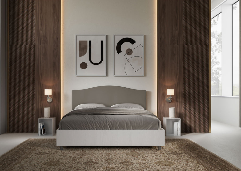 Letto Matrimoniale con Rete e Contenitore Alzata Comoda Struttura Bianco Frassico e Testata in Similpelle Grace Cappuccino Varie Misure