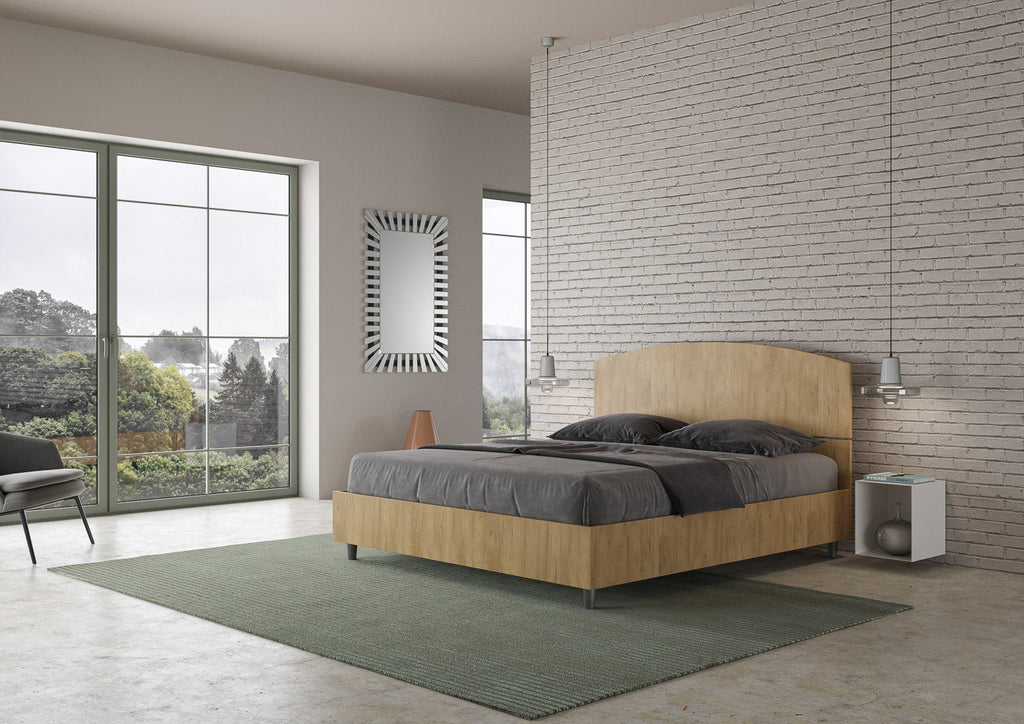 Lit double Dora entièrement réalisé en panneaux de bois anoblis. Un modèle jeune et moderne parfait pour tout style d'ameublement. Le matériau avec lequel il est fabriqué confère à l'espace nuit une agréable sensation d'accueil caractéristique du bois. La tête de lit arquée enrichit l'espace avec design et style. Cette fonctionnalité peut également faire ressortir le mur derrière vous. Entièrement fabriqué en Italie avec un design et des matériaux 100 % Made in Italy.
