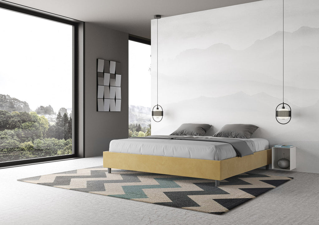 Lit sommier modèle Azelia avec cadre de lit rembourré. Le lit Azelia se présente comme un lit extrêmement simple et linéaire, où la facilité de placement dans la pièce règne certainement en maître. La particularité est sans aucun doute donnée par l'absence de tête de lit qui vous permettra de la placer n'importe où, sous une fenêtre, dans un grenier ou près d'un mur particulièrement impressionnant sans que cela vous empêche de l'apprécier pleinement.