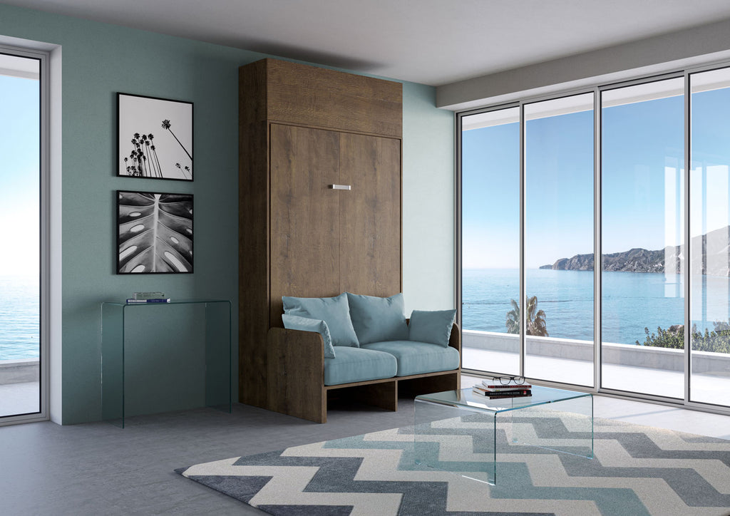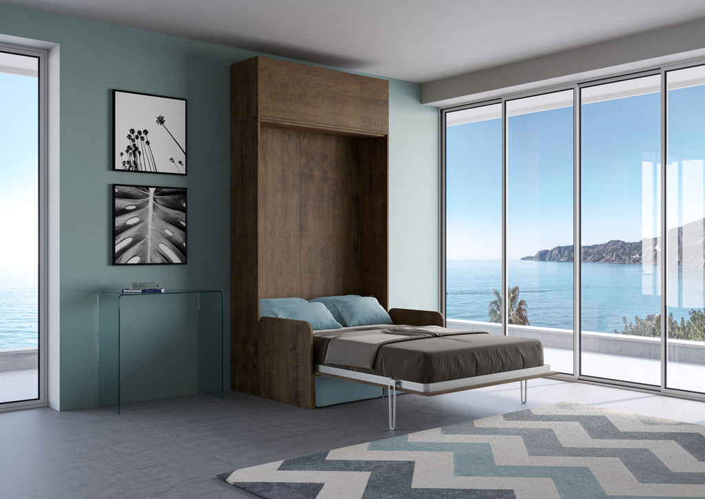 Letto Matrimoniale Francese A Scomparsa 140 Kentaro Con Divano E Pensile Noce e Azzurro