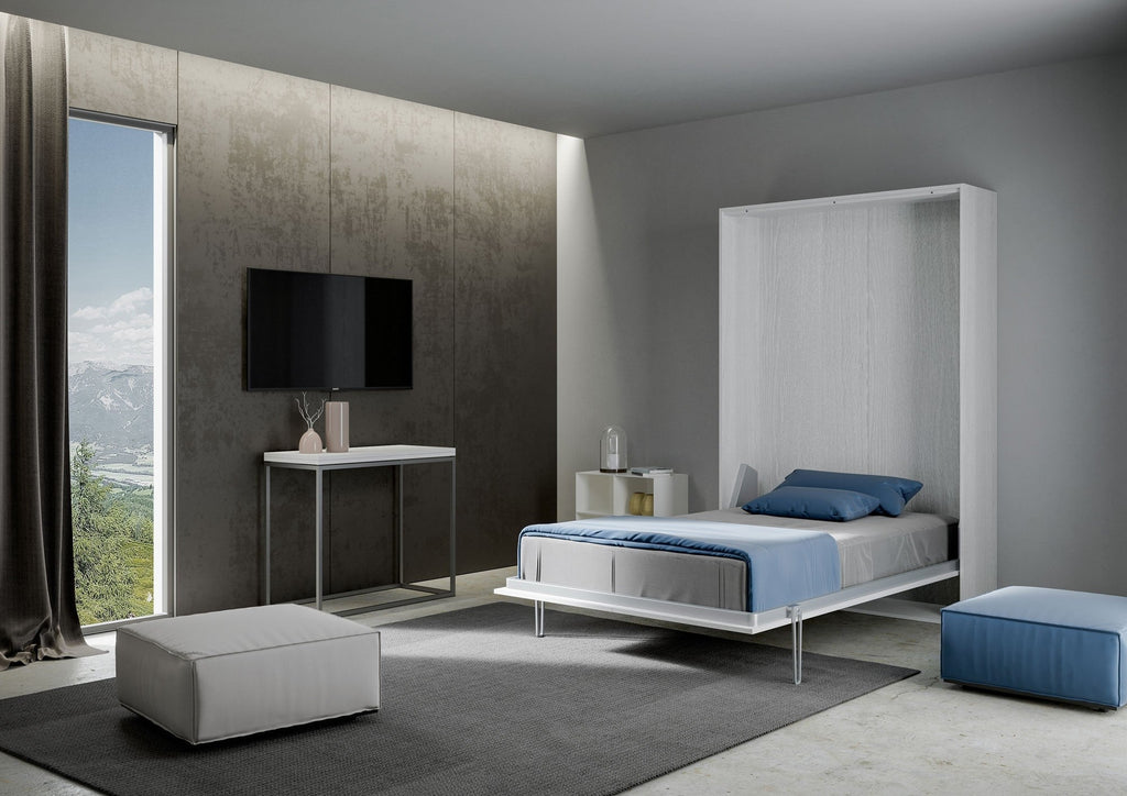 Lo spazio, come alcuni elementi d'arredo sono indispensabili in una casa. Non rinunciare ad un sano riposo. Ora con il letto matrimoniale richiudibile Kentaro avrai a disposizione tutta la comodità che ti serve in uno spazio ridottissimo, solo 39 cm a parete. Quando è aperto, non occupa più di un letto normale, solo 215 cm; così avrete a disposizione tutto lo spazio per le altre attività giornaliere. Particolarmente adatto in monolocali o in ambienti dove vi è la necesità i avere spazi utili durante il giorno. La discesa del letto è assistita con pistoni a gas. Il materasso che può essere usato non deve superare i 24 cm di spessore. Quando aperto, l'altezza da terra della rete è di 22 cm. E' obbligatorio il fissaggio a muro.