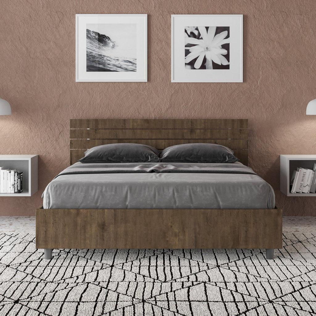 Lit français modèle Ankel, avec tête de lit droite et cadre de lit en particules de microbois. Le modèle Ankel est une solution fraîche et moderne adaptée à tout âge et contexte. Le matériau avec lequel il est fabriqué confère à l'espace nuit une agréable sensation d'accueil caractéristique du bois. Il possède une tête de lit droite avec des lattes horizontales qui définissent son design, mettant encore plus en valeur le mur derrière lui.