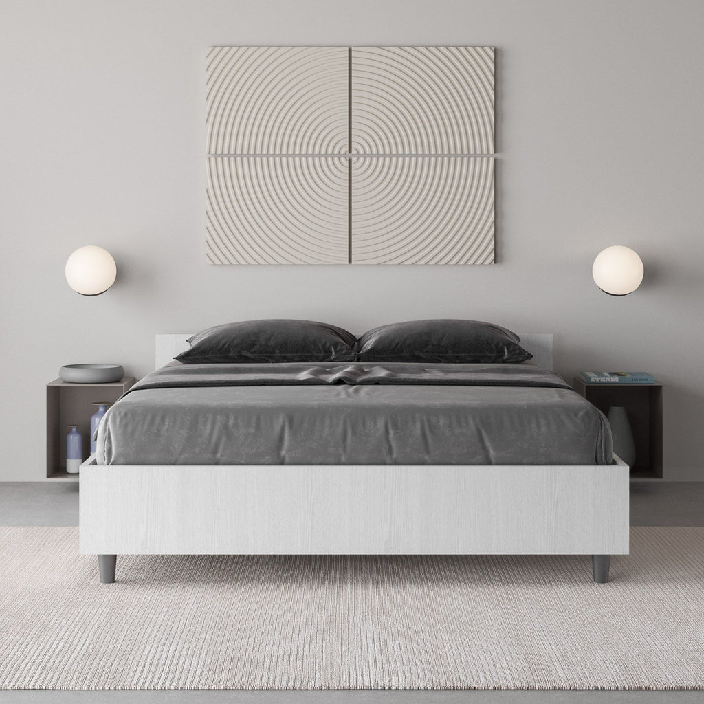 Lit français modèle Nuamo, avec tête de lit et cadre de lit en microparticules de bois. Nuamo est un lit conçu pour ceux qui ont un goût fin et élégant. La combinaison du style et du matériau dont est constituée la structure confère à la pièce une plus grande chaleur et un plus grand confort typique du bois. L'élément distinctif de ce modèle est sans aucun doute la tête de lit basse, qui permet de positionner parfaitement le lit sous une fenêtre, une armoire ou contre un mur marquant sans recouvrir le motif.