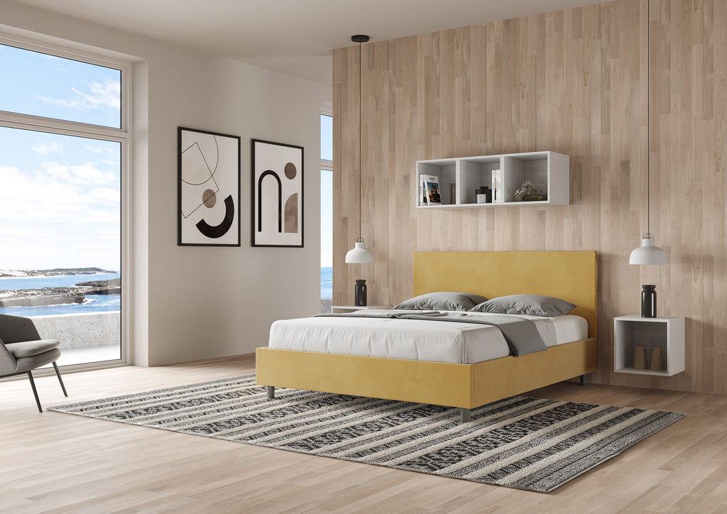 Letto Matrimoniale Giroletto con Alzata Comoda Imbottito in Microfibra Adele Ocra Varie Misure