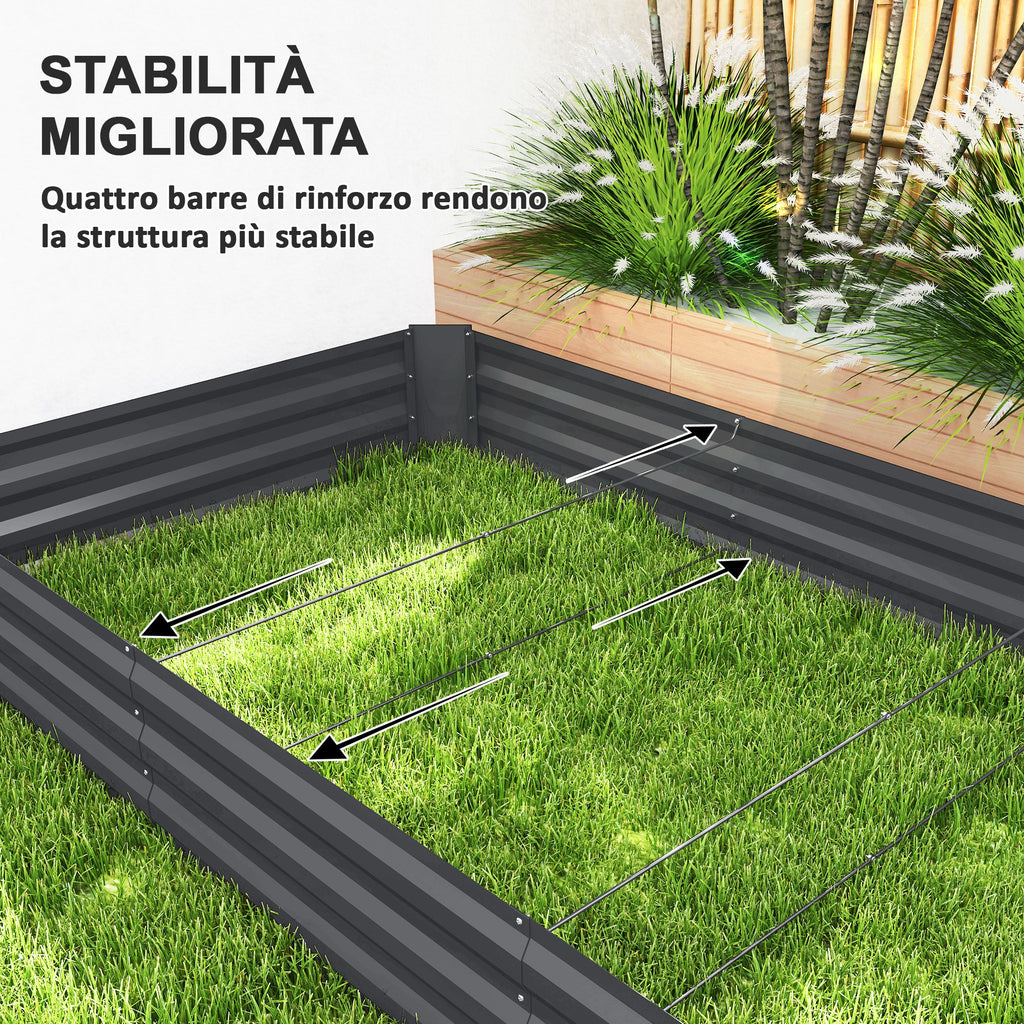 Esplora la versatilità della fioriera per piante! Realizzato in acciaio galvanizzato a prova di ruggine e resistente al maltempo, questo letto orto rialzato garantisce una lunga durata nel tuo giardino. Con una capacità di terriccio di 835L, fornisce ampio spazio per la crescita rigogliosa di fiori, erbe aromatiche e verdure, garantendo un giardino rigoglioso anno dopo anno. La capacità di 835L di terreno della fioriera da esterno offre ampio spazio per la crescita delle piante. La struttura in acciaio zincato rende il letto per orto rialzato resistente alla ruggine e ai danni causati dagli agenti atmosferici. Le barre di rinforzo interne garantiscono maggiore stabilità e durata. Il fondo aperto impedisce l'accumulo di acqua, riducendo il rischio di marciume. Montaggio necessario.