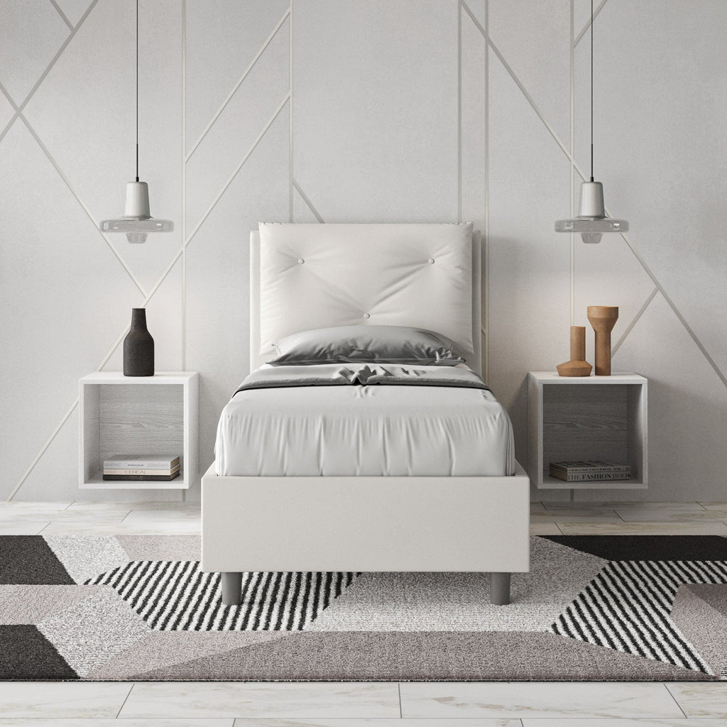 Lit modèle Appia avec cadre de lit rembourré. La combinaison parfaite entre élégance et confort est certainement représentée par le lit Appia. Modèle rembourré avec coussins matelassés s'étendant sur toute la tête de lit, enrichi de trois boutons pour former un triangle. Le simili cuir dont est recouvert le lit Appia permettra un nettoyage simple et rapide grâce à un chiffon microfibre commun.