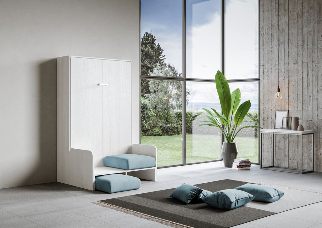 Letto Una Piazza E Mezzo A Scomparsa 120 Kentaro Con Divano Bianco Frassino e Azzurro