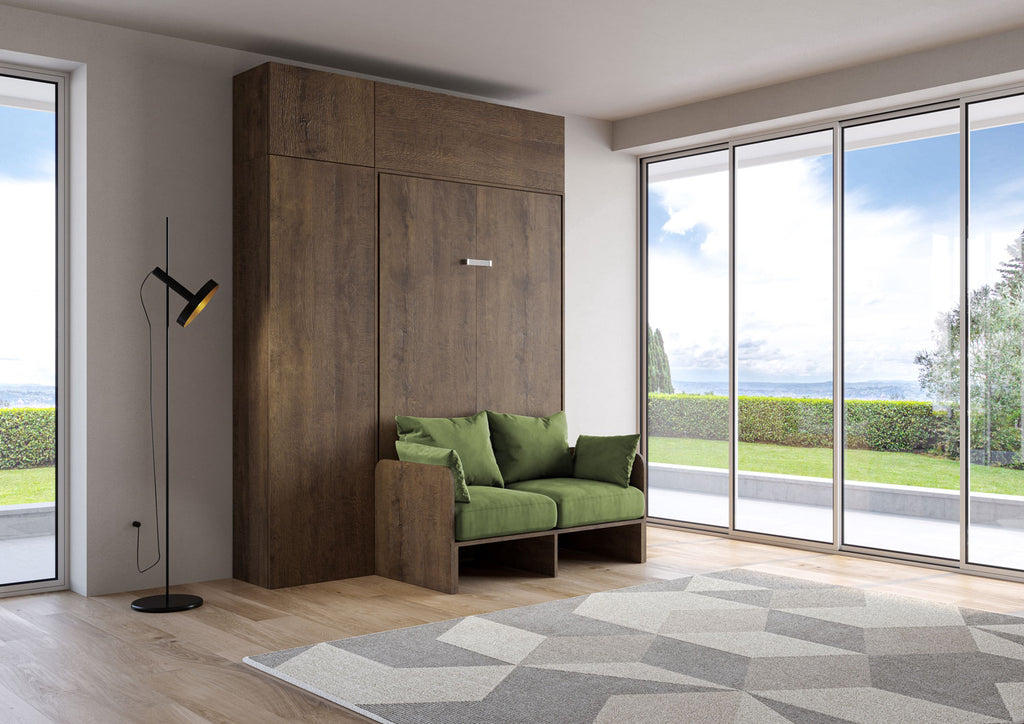 Letto Una Piazza E Mezzo A Scomparsa 120 Kentaro Con Divano E Mobili Noce e Verde