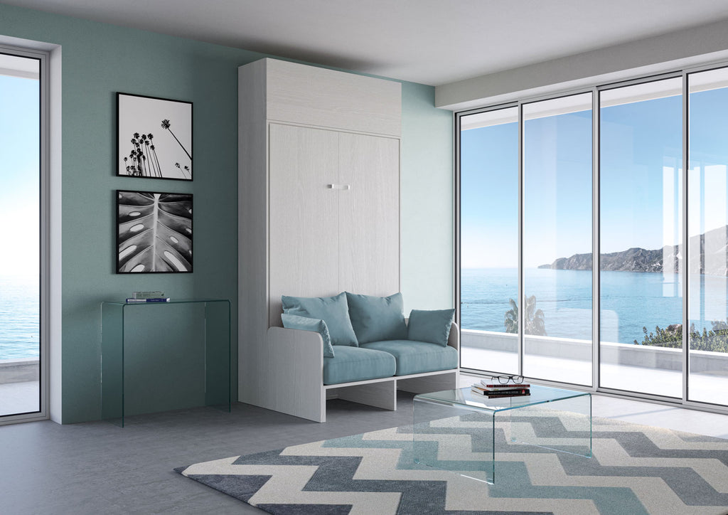 Letto Una Piazza E Mezzo A Scomparsa 120 Kentaro Con Divano E Pensile Bianco Frassino e Azzurro