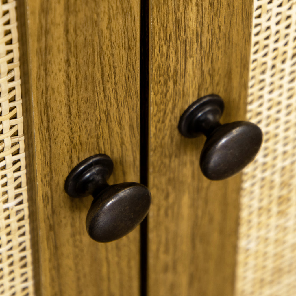 - IN RATTAN: Questa libreria moderna è caratterizzata da una lavorazione artigianale del rattan sull'anta del mobile, combinando così uno stile rustico ed elementi bohémien che ottengono come risultato un grande elemento di arredo