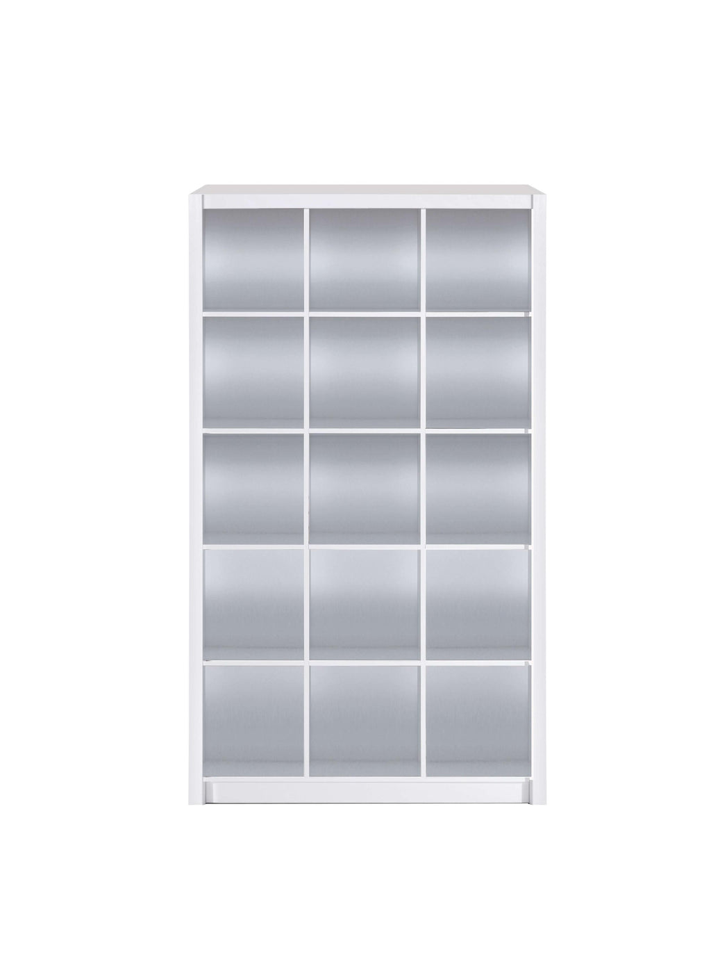 - Étagère 3 colonnes de 5 niveaux chacune, pour un total de 15 compartiments.