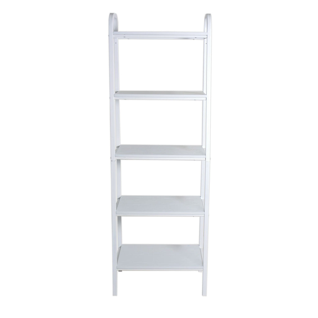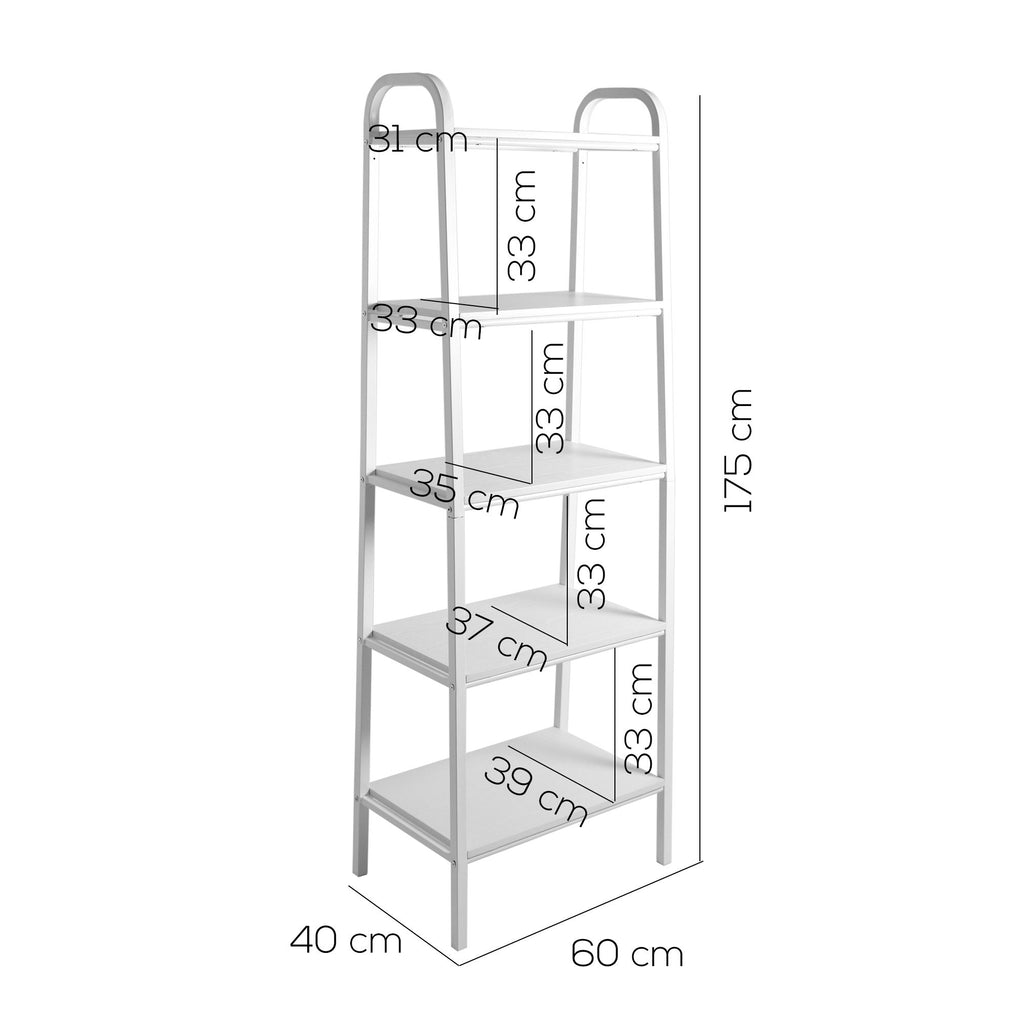 Libreria bianca interamente in metallo con tappi in PVC e ripiani legno