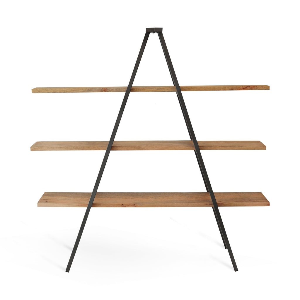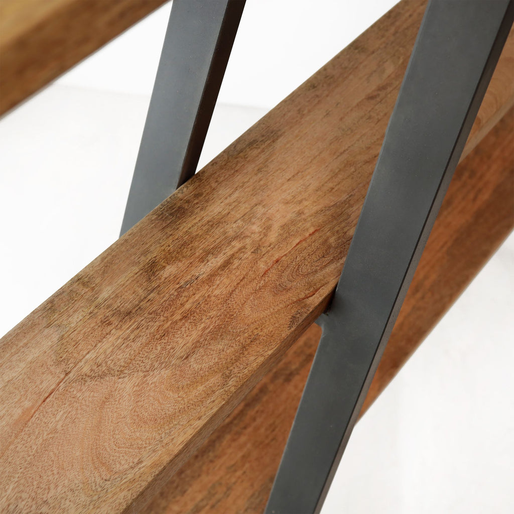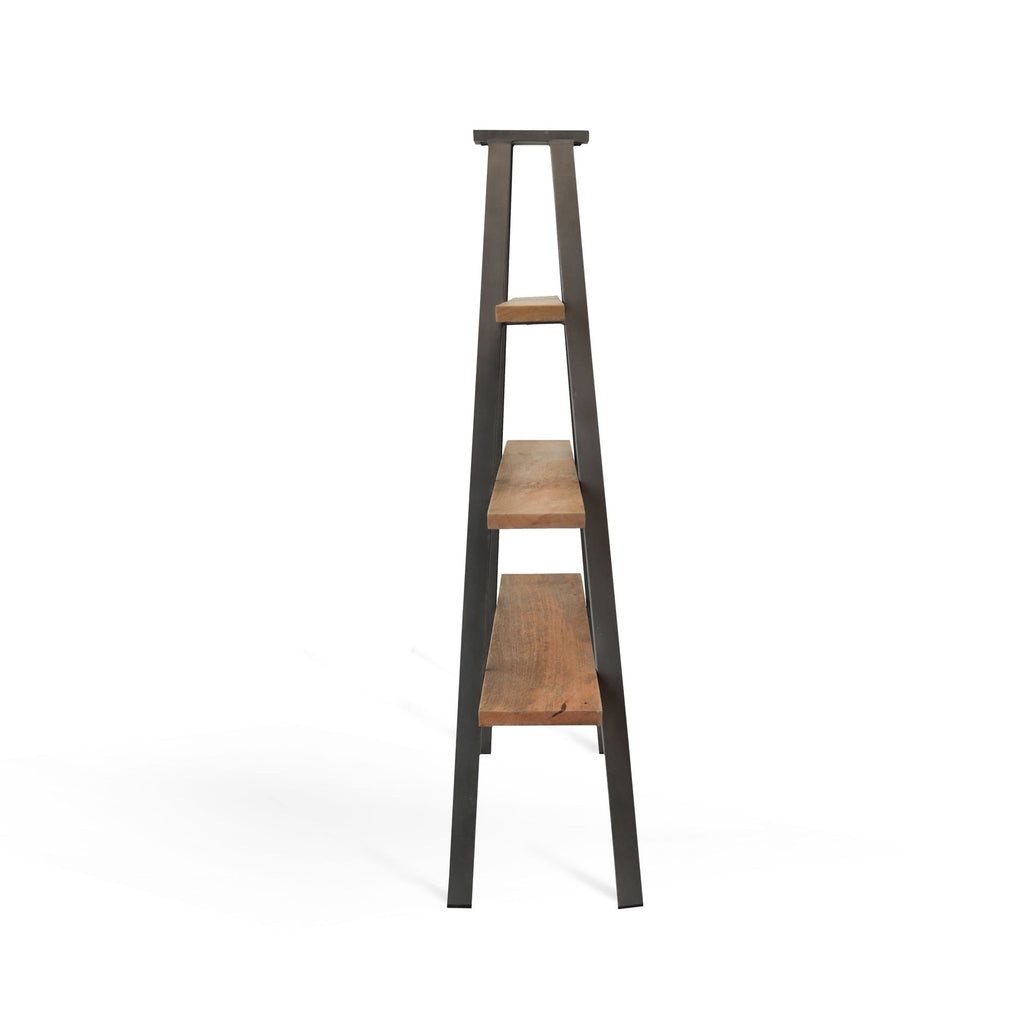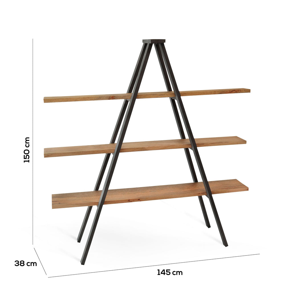 Struttura in metallo nero e tre mensole in legno effetto anticato formano la libreria Rock. LA vera particolarità è il design, la struttura metallica ricorda quello delle scale a pioli aperta, sulla quale sono posate tre robuste mensole in legno ecofriendly. Rock è una libreria unica e originale ideale per living, studio o uffici dall'allure esclusivo.
