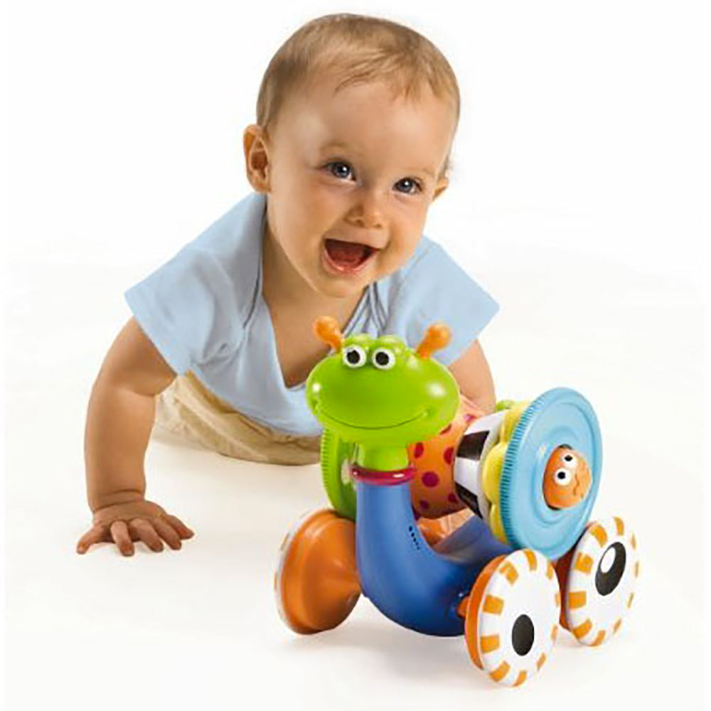 The Funny Snail (2 jeux en 1) : pressez la queue pour activer le mouvement et l'effet musical. Tourne la tête et la coquille tout en se déplaçant. Jouet parfait pour apprendre à ramper. La maison en coquille apparaît dans une tour de 7 pièces avec un personnage compressible au sommet. Fonctionne avec 3 piles AA incluses.