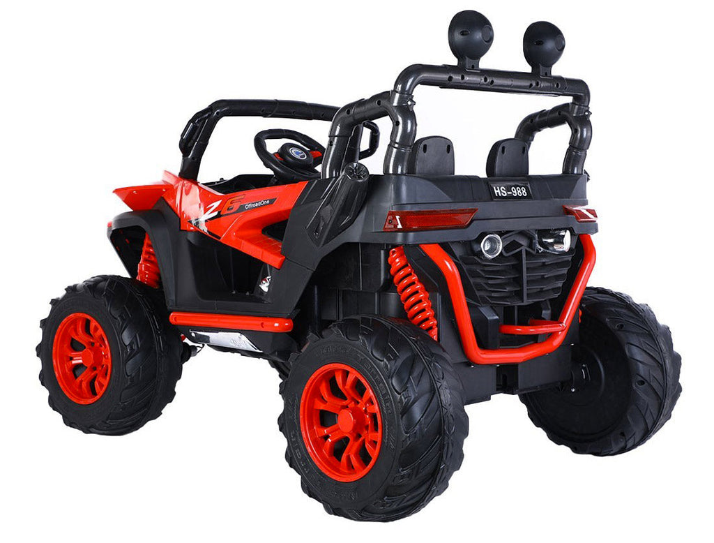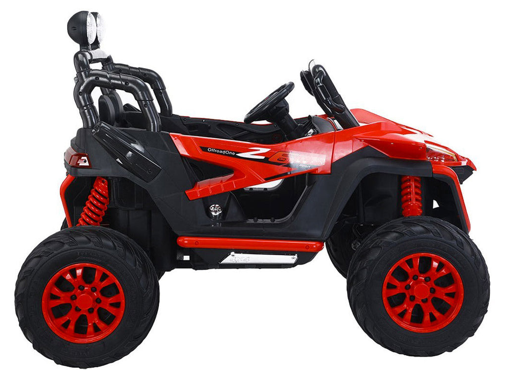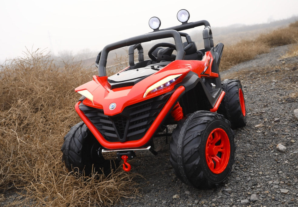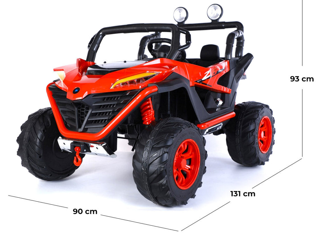 Pour vivre une aventure intemporelle, la voiture télécommandée est équipée de quatre grandes roues en plastique avec une partie centrale en caoutchouc et un siège ergonomique, des spots LED sur la barre avant et une suspension pour s'adapter à tous les sols.