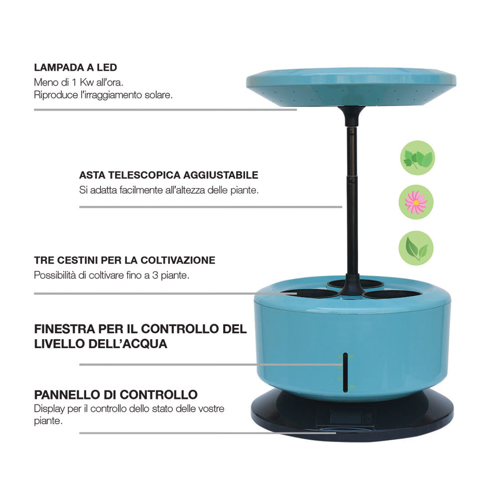 Dédié aux amateurs de culture hydroponique, il fonctionne à l'électricité avec une consommation quotidienne minimale et grâce au réservoir interne, il permet aux plantes d'avoir une recirculation constante de l'eau.