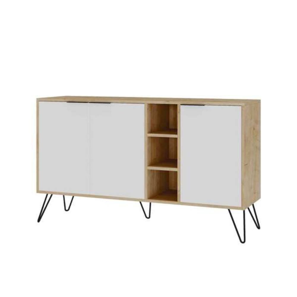 La madia Clara rovere con 3 ante bianco è realizzata in truciolare di alta qualità rivestito in melaminico, con uno spessore di 18 mm. La struttura è di colore rovere oak, mentre le ante sono bianche. Dispone di tre ante, due ripiani interni e tre vani a giorno. I piedi, in metallo nero, hanno un'altezza di 20 cm. Le misure della madia sono 142x35,5x83 cm. Il prodotto viene fornito smontato e il codice identificativo è MK209853.