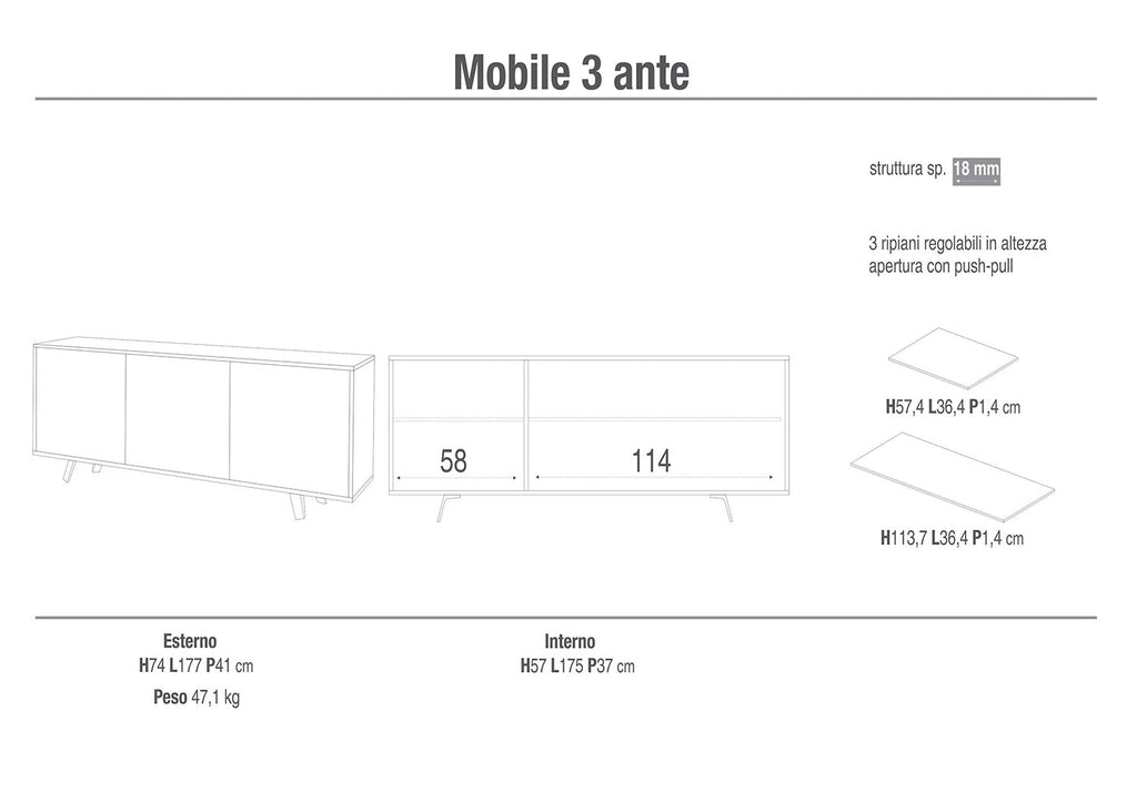 Madia 3 Ante 177x74x41 cm Ossido Bianco/Ossido Nero