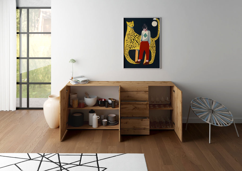 La madia Elios, mobile dal design elegante e intramontabile, perfetto per adattarsi con facilità a ogni stile di arredamento. La sua versatilità e funzionalità lo rendono una scelta ideale per arricchire ogni ambiente della tua casa. La madia Elios con tre ante e tre cassetti, dotata di due ampi vani interni con ripiani centrali, è la soluzione ideale per mantenere in ordine e avere sempre tutto a portata di mano. La madia viene fornita smontata.