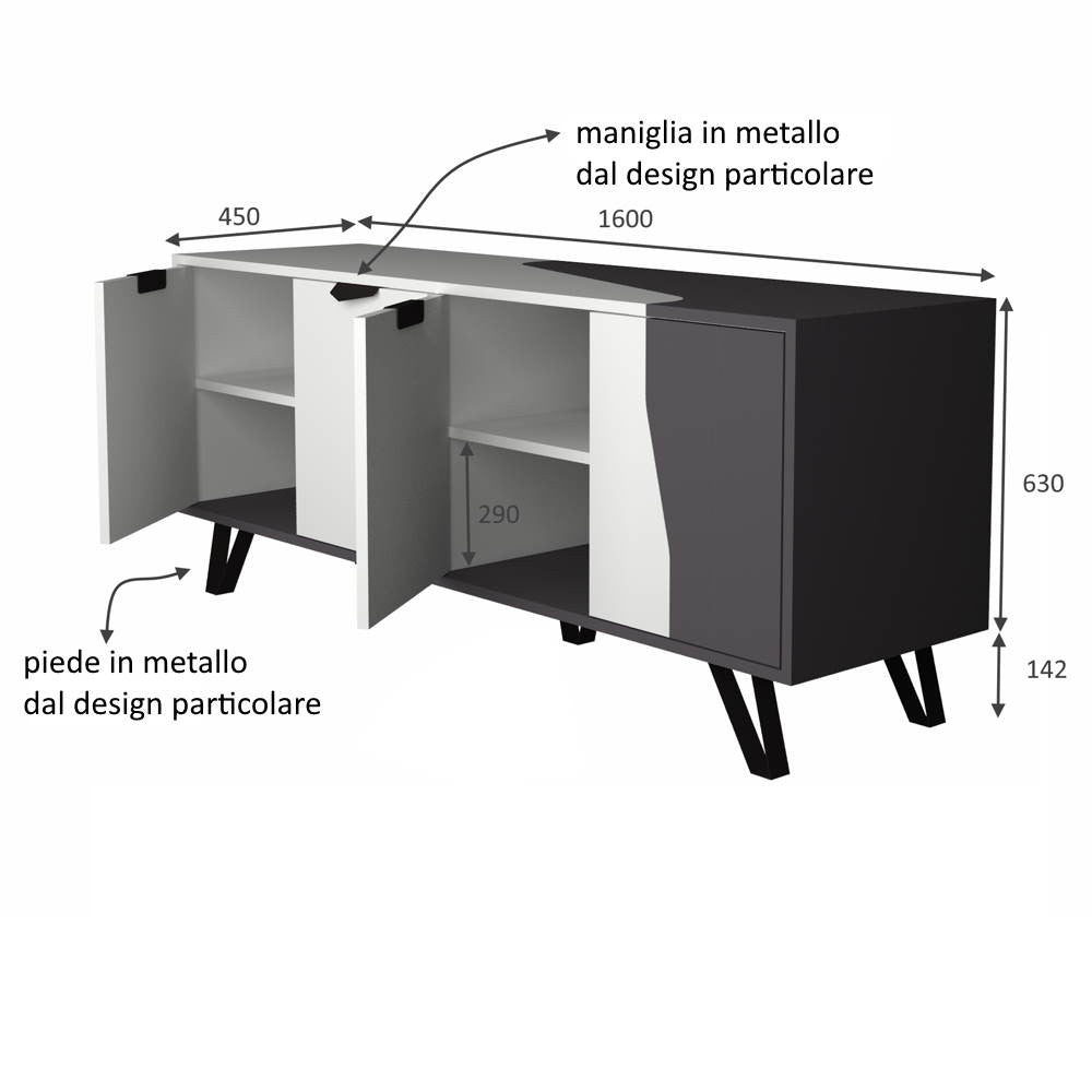 Madia dal design unico. Il colore bianco viene macchiato dalla tinta ghisa in modo irregolare, conferendo un gioco di forme davvero originale. Anche la particolare forma dei piedini e delle maniglie in metallo nero, rendono questa madia davvero esclusiva. Dotata di 4 ante e vani molto capienti.