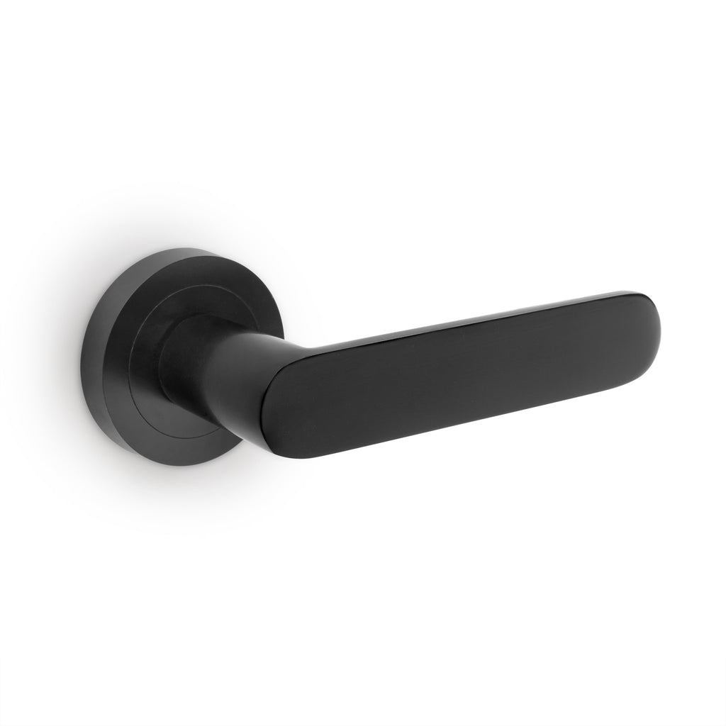 Poignées de porte intérieures Bunbury avec rosace Ø50 mm en aluminium noir 5 ensembles. Emuca