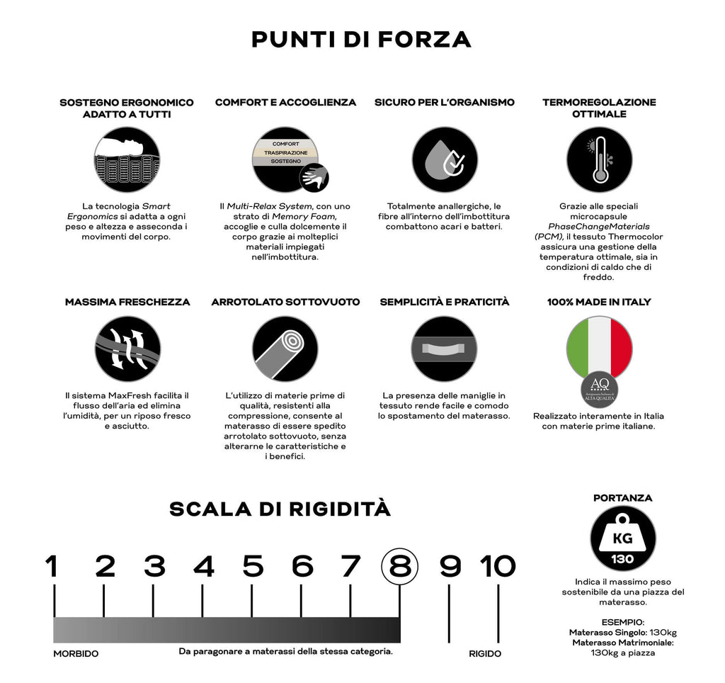 Les matelas Valiani conçus et produits avec le souci du détail de la fabrication Made in Italy, avec de la mousse sans CFC, sont un symbole de l'excellence de la fabrication italienne, sont synonymes de solidité et de durabilité dans le temps et garantissent un maximum de bien-être de repos.