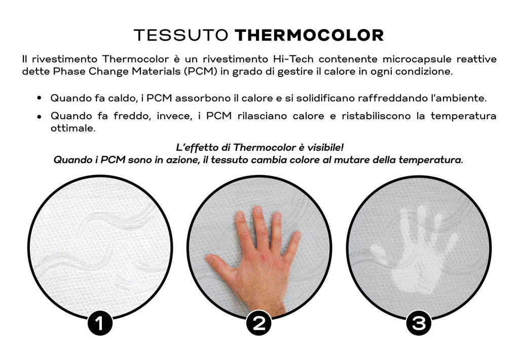 Revêtement thermocoloré , tissu de haute technologie contenant des matériaux à changement de phase (PCM), des microcapsules réactives spéciales capables de gérer la chaleur : lorsque la température augmente, les PCM absorbent la chaleur et changent leur état de solide à liquide, rafraîchissant le corps ; lorsque la température baisse, ils se solidifient et dégagent de la chaleur.