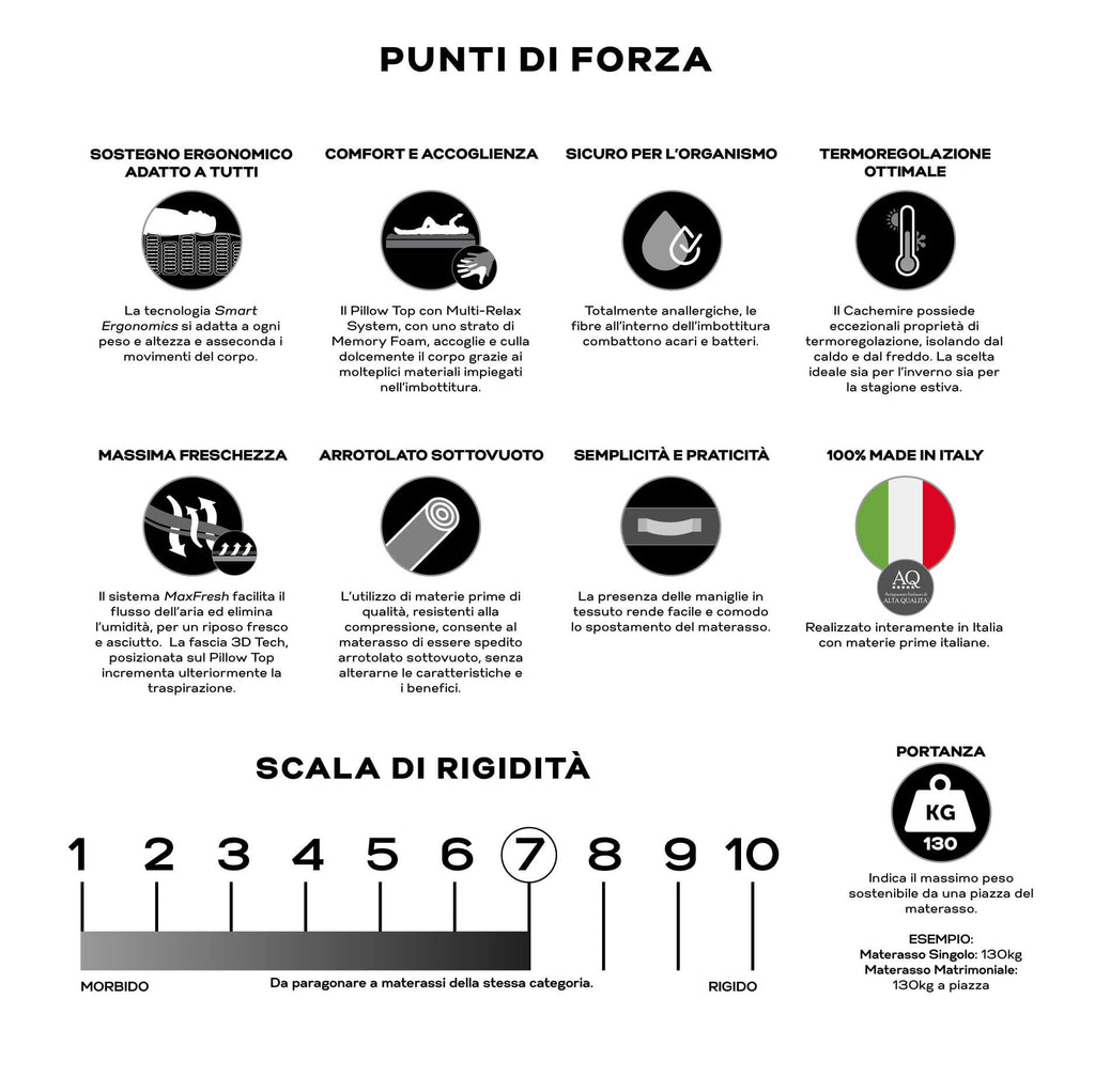 Les matelas Valiani conçus et produits avec le souci du détail de la fabrication Made in Italy, avec de la mousse sans CFC, sont un symbole de l'excellence de la fabrication italienne, sont synonymes de solidité et de durabilité dans le temps et garantissent un maximum de bien-être de repos.