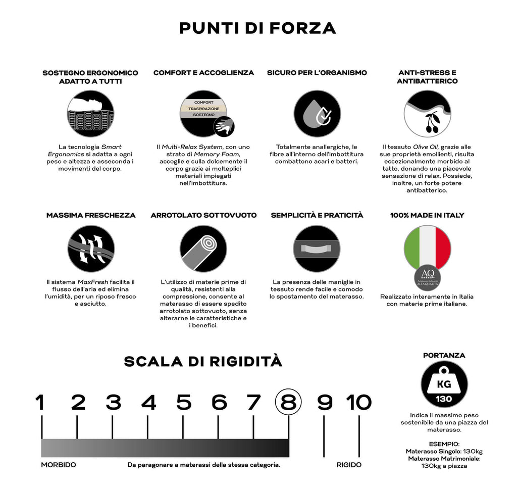 Les matelas Valiani conçus et produits avec le souci du détail de la fabrication Made in Italy, avec de la mousse sans CFC, sont un symbole de l'excellence de la fabrication italienne, sont synonymes de solidité et de durabilité dans le temps et garantissent un maximum de bien-être de repos.